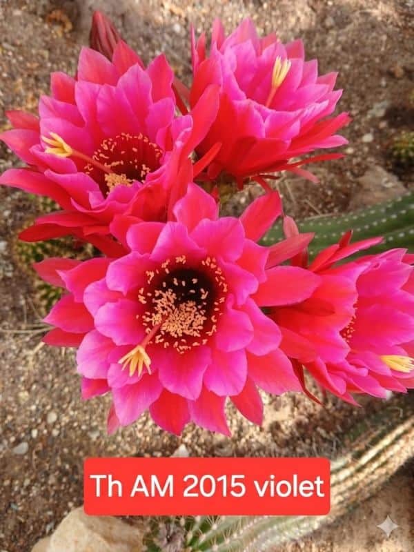 Le code AM dans le nom du cultivar Trichocereus AM 2015 violet désigne l’hybrideur allemand Andreas Möller.