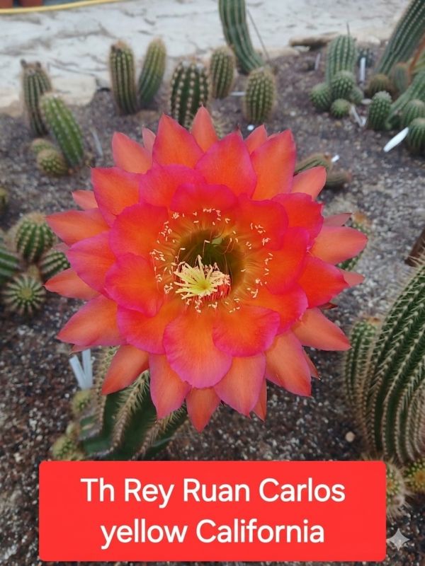 le Trichocereus ‘Rey Ruan Carlos X yellow California’ appartient à la famille des hybrides de Trichocereus (souvent classés aujourd’hui sous le genre Echinopsis), particulièrement prisés pour leur floraison spectaculaire.